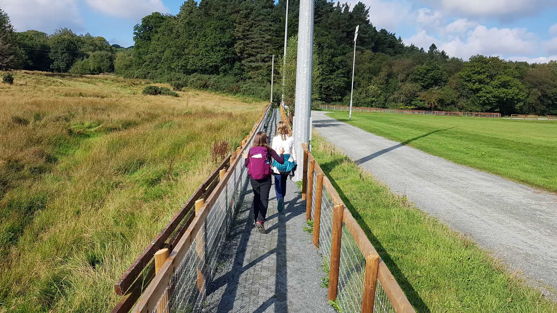 Here the rain came in sheets of grey water, so I sheltered under spruces and waited for it to ease. There were some yellow arrows painted on the ground along my walk, but they are not part of the trail – keep with the waymarker posts. These lead you down through the forest and out to the hamlet of Clara Vale, with its pretty bridge, church and school building.