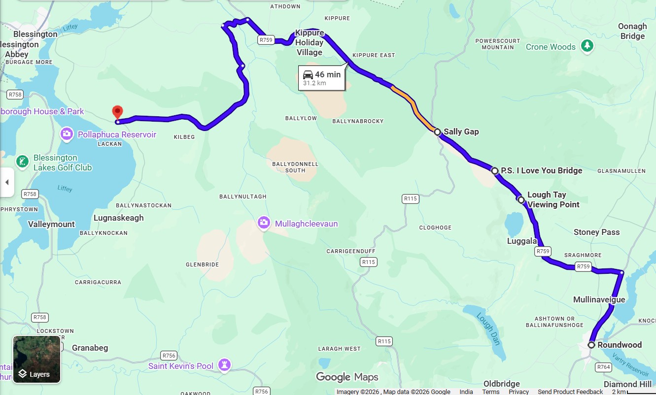 The drive from Roundwood across Sally Gap is straightforward but full of wide mountain views and quiet stretches of road. You pass Lough Tay between the hills, then continue through open bogland and gentle slopes. With Bell X1, Kate Bush, The Pogues, Tracy Chapman, U2 and more playing in the background, it’s an easy, steady journey that leads down to the calm waters of the Blessington Lakes.